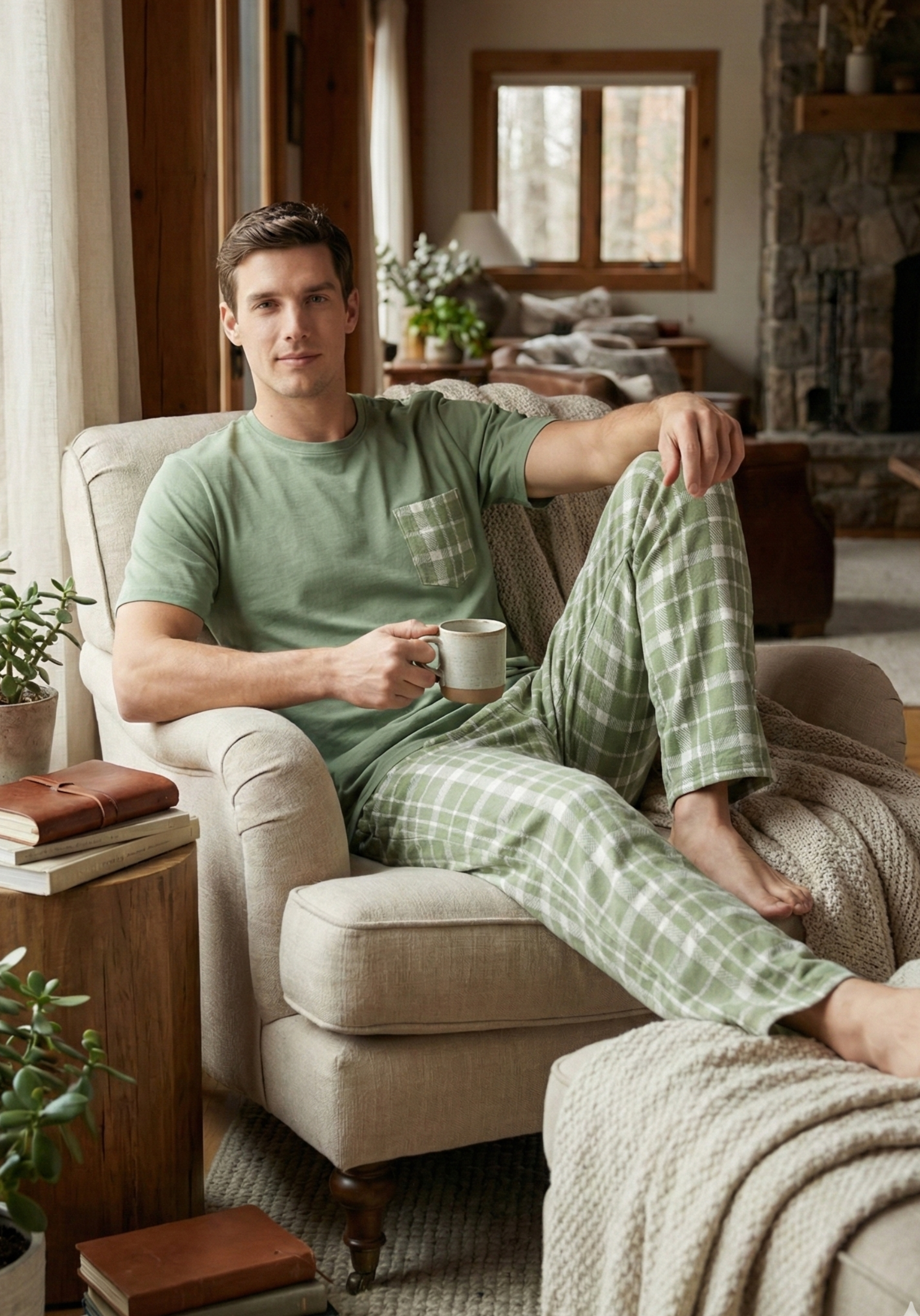 Men's Sage Green T-Shirt & Plaid Lounge Set